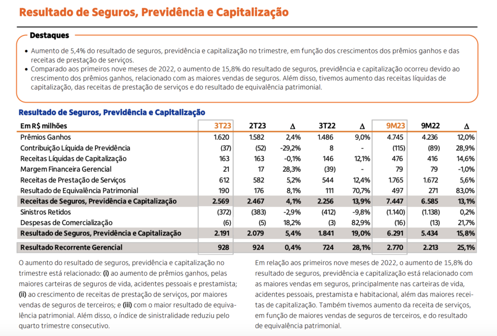 O Itaú registrou um lucro recorrente de R$ 9 bilhões no terceiro trimestre, alta de 3,4% no trimestre e de 11,9% em 12 meses. Em seguridade, o resultado foi de R$ 2,5 bilhões no trimestre, alta de 4,1% e de 13,9% em 12 meses. Em nove meses, o resultado com seguros, previdencia e capitalização foi de R$ 5,4 bilhões, alta de 15,8% em relação ao mesmo período do ano anterior.