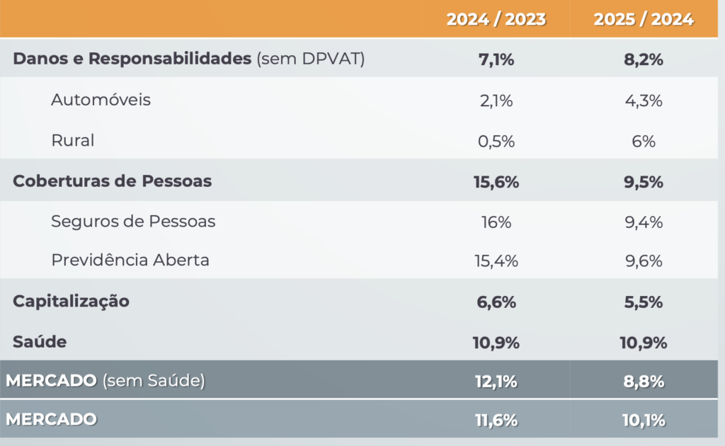 Para 2024, a projeção de crescimento é de 11,6%, com a arrecadação estimada em R$ 747,3 bilhões, considerando-se todos os produtos de seguros, previdência aberta, capitalização e a saúde suplementar.