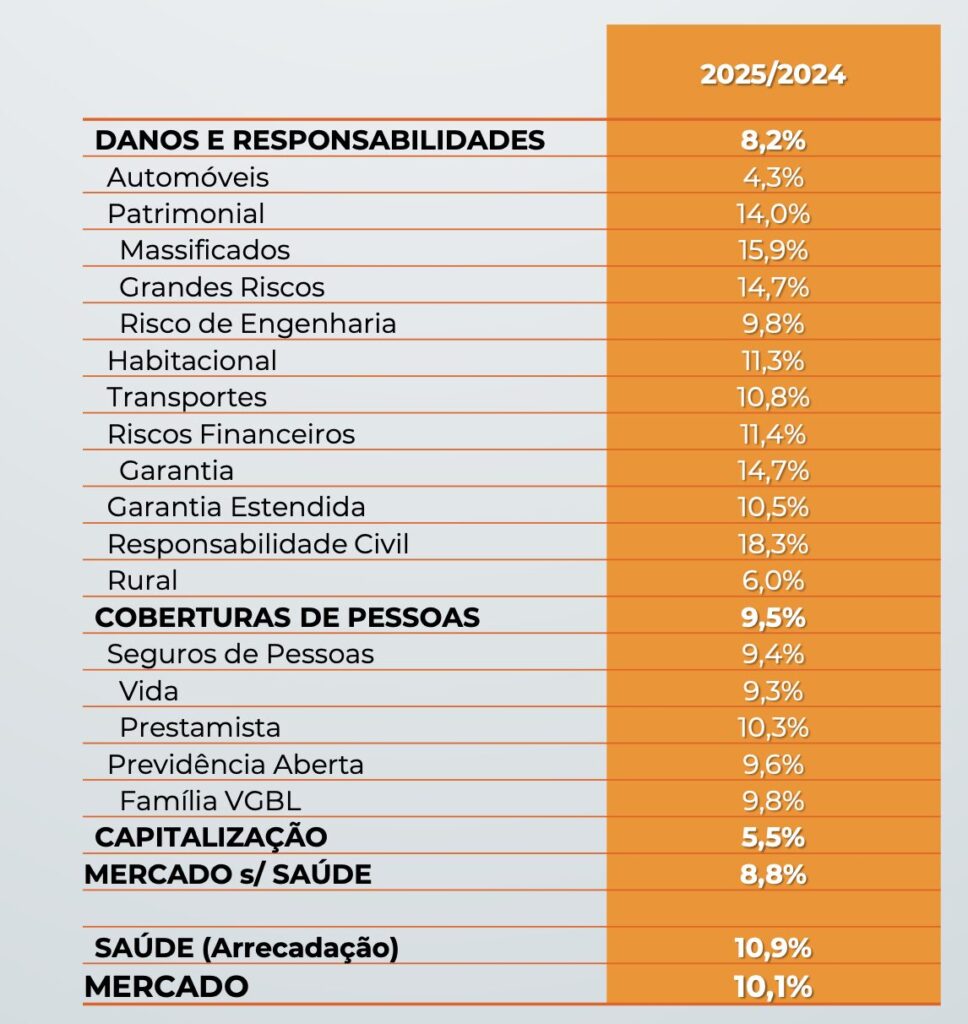 Crescimento de um dígito das vendas do setor de seguros em 2025: 8,8%. Esta foi a previsão apresentada pela Confederação Nacional das Seguradoras (CNseg) em coletiva realizada nesta tarde, em São Paulo. Se considerado saúde, a estimativa sobre para 10,1% do setor, levando em conta uma projeção de Produto Interno Bruto (PIB) de 2,5%, Selic de 12,5% e inflação de 3,98%.