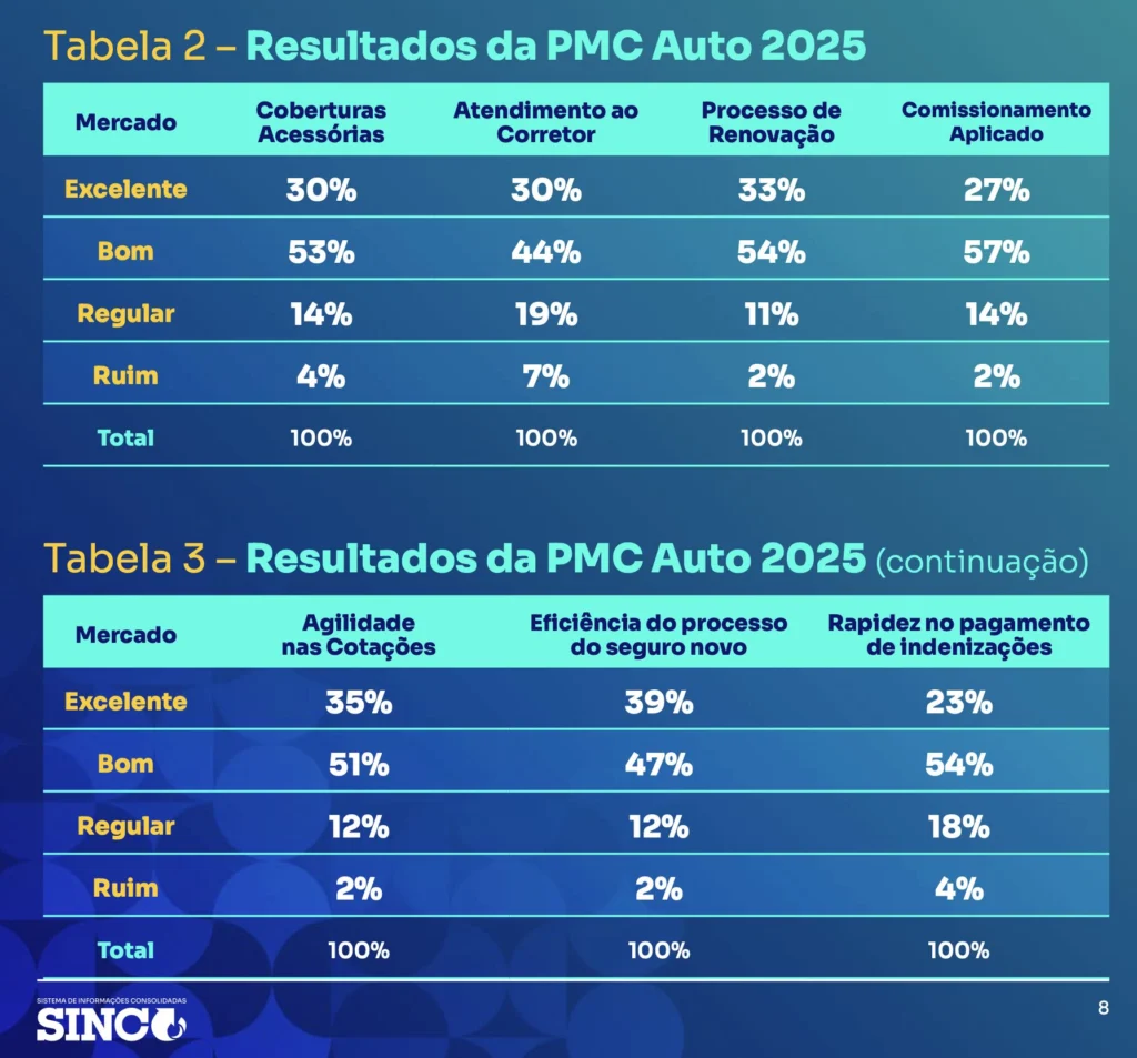 De acordo com a pesquisa, a maior parte das respostas ficou concentrada nas opções “Bom” ou “Excelente” em todos os sete quesitos analisados. O processo de renovação e a emissão de novos seguros foram os itens mais bem avaliados, com mais de 70% de opiniões positivas. Já no quesito rapidez no pagamento de indenizações, 18% dos corretores classificaram o serviço como “Regular” e 4% como “Ruim”, sinalizando que ainda há espaço para melhorias.