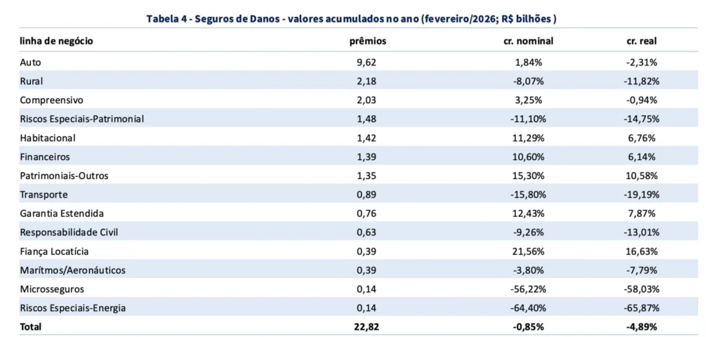 Os produtos mais próximos da estabilidade foram o seguro auto, que cresceu 1,84% em termos nominais, embora ainda tenha recuado 2,31% em termos reais, e o compreensivo, com alta nominal de 3,25% e queda real de 0,94%. Em pessoas, acidentes pessoais e viagem tiveram retrações moderadas, de 3,71% e 3,83%, respectivamente, o que indica um começo de ano mais lateral nessas carteiras. A própria Susep ressalva que parte dessas oscilações pode refletir movimentos sazonais em algumas linhas de negócio.