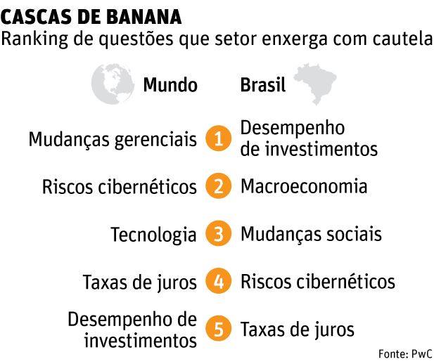 Vida e Seguros Gerais – As seguradoras de vida listaram neste mesmo estudo como maior risco as baixas taxas de juros dos países desenvolvidos, que prejudicam sua capacidade de obter rendimentos capazes de cobrir seus compromissos de longo prazo. Já as de não-vida escolheram as novas tecnologias, e as resseguradoras, as ameaças cibernéticas. O resultado reflete o estado de transformação em que os seguros se encontram atualmente. Em 2015, a gestão de mudanças ocupava apenas a sexta colocação do ranking, enquanto os riscos cibernéticos ficaram em quartos, e a adoção de novas tecnologias nem aparecia entre as “cascas de banana” do setor. Entre os seguradores não-vida, a possibilidade de defasagem tecnológica foi a “casca de banana” que ficou em primeiro lugar no ranking.