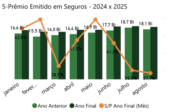 O mercado segurador brasileiro faturou, no acumulado de janeiro a agosto, R$ 145,7 bilhões, avanço de 7,1% sobre o mesmo período de 2024. Apenas em agosto, dado mais recente do setor, foram R$ 19 bilhões de prêmios emitidos em seguros. É o que mostra análise divulgada pelo IRB+Inteligência, plataforma de dados do IRB(Re).