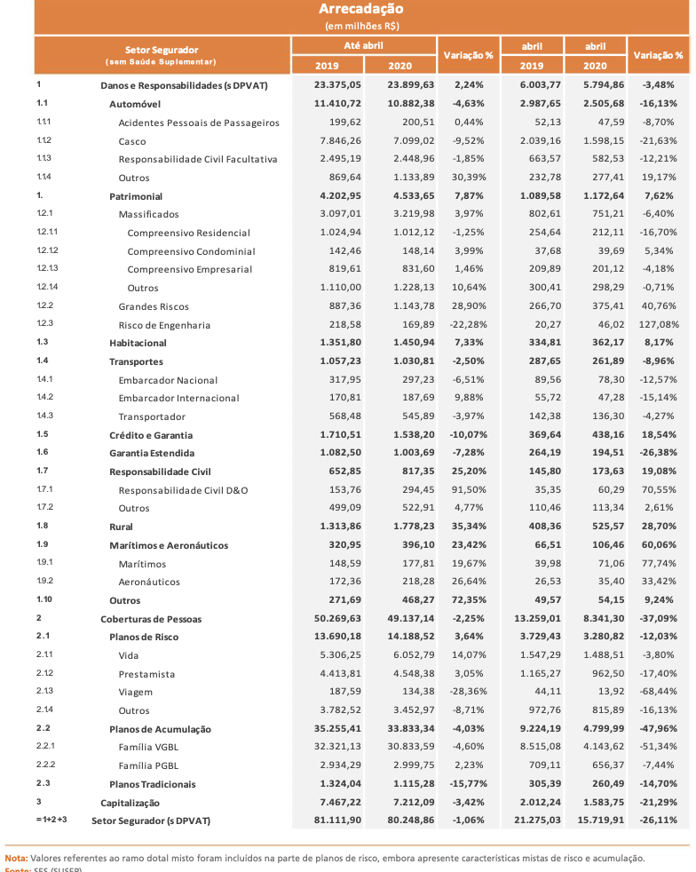 A Agencia Brasil informa que o resultado já era esperado e reflete os impactos da pandemia do novo coronavírus. Como o isolamento social para evitar a disseminação do vírus foi decretado em meados de março, aquele mês não refletiu a queda da produção e do consumo como ocorreu em abril. “Mas em abril, como o mês veio cheio, a queda foi forte”, comentou Coriolano. O presidente da CNSeg observou que a retração registrada no mercado de seguros não ficou muito distante da queda que tiveram a produção industrial e o varejo, no período. “A queda está em linha com o que aconteceu nos demais setores da economia, o que é natural”. O setor de seguros responde aos estímulos de produção e de consumo.